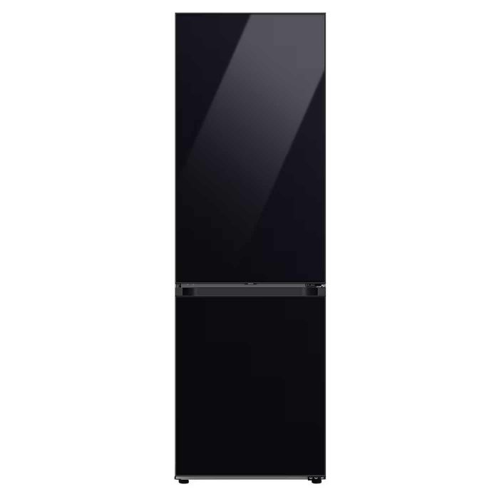 تصميم Bespoke المخصص: واجهة من الزجاج الأسود الفخم (Clean Black Glass) تمنح مطبخك مظهراً عصرياً وفريداً، مع إمكانية دمجها مع وحدات Bespoke أخرى.