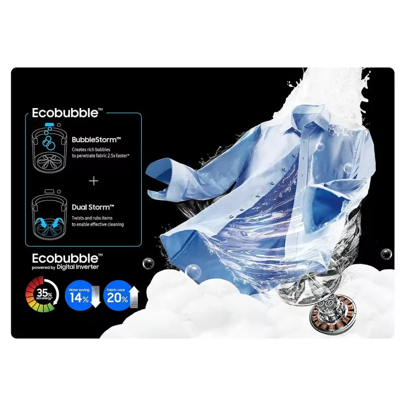 تقنية Ecobubble™️: تعمل على تحويل المنظف إلى فقاعات تخترق الأنسجة بسرعة، مما يزيل الأوساخ بفعالية أكبر بنسبة 20% حتى في الماء البارد.